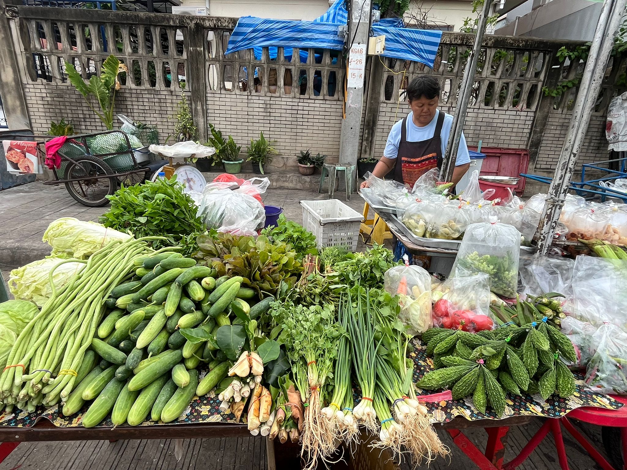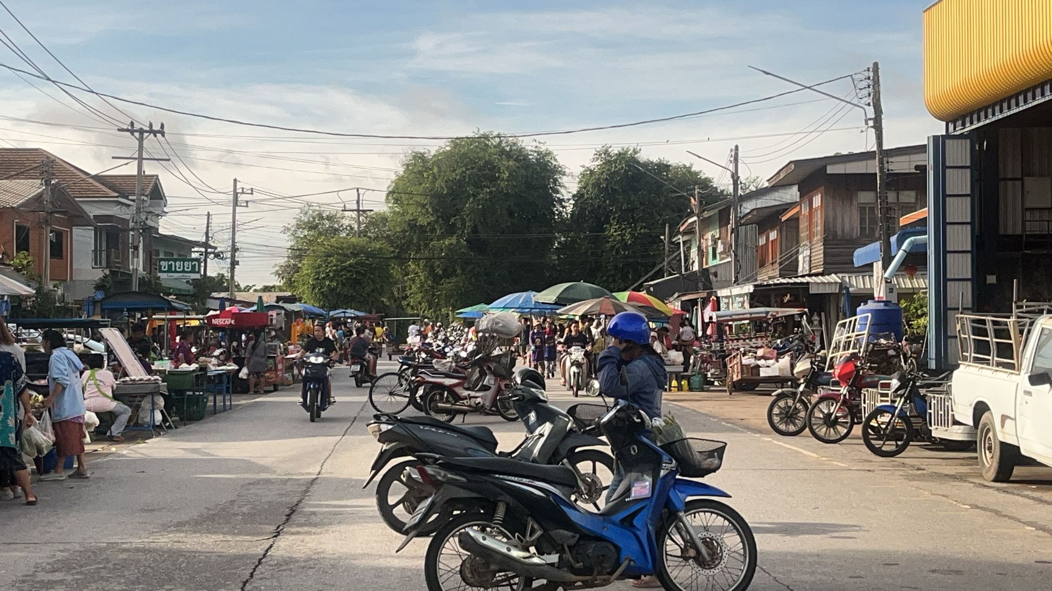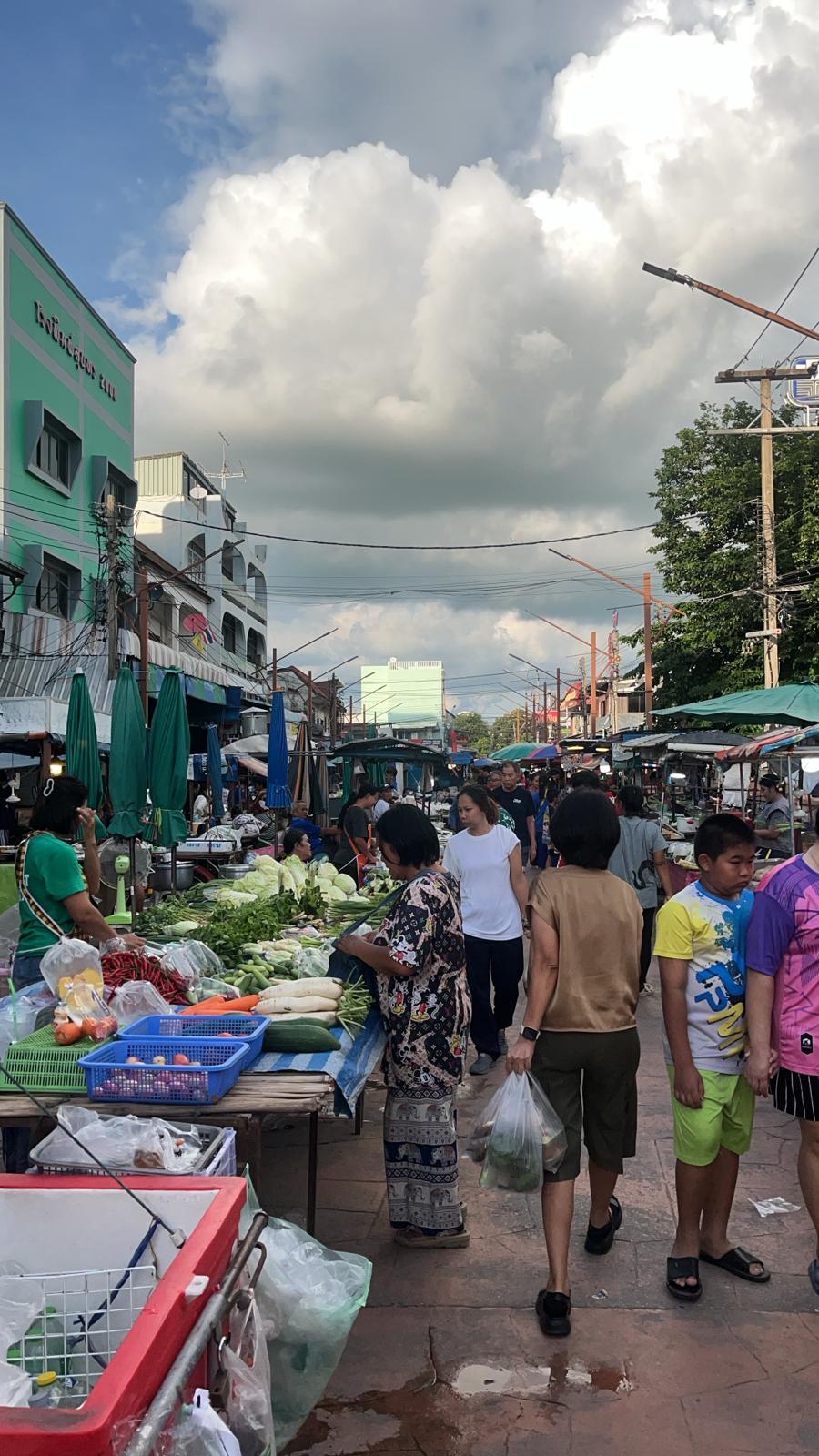 Vibrant local market with fresh produce, breakfast items, traditional snacks and authentic morning atmosphere.